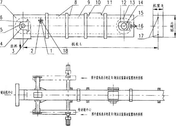 9、輸送鏈 10、中間節(jié)(非標(biāo)) 11、進(jìn)料口 12、尾軸承箱 13、尾輪 14、尾軸 15、尾部